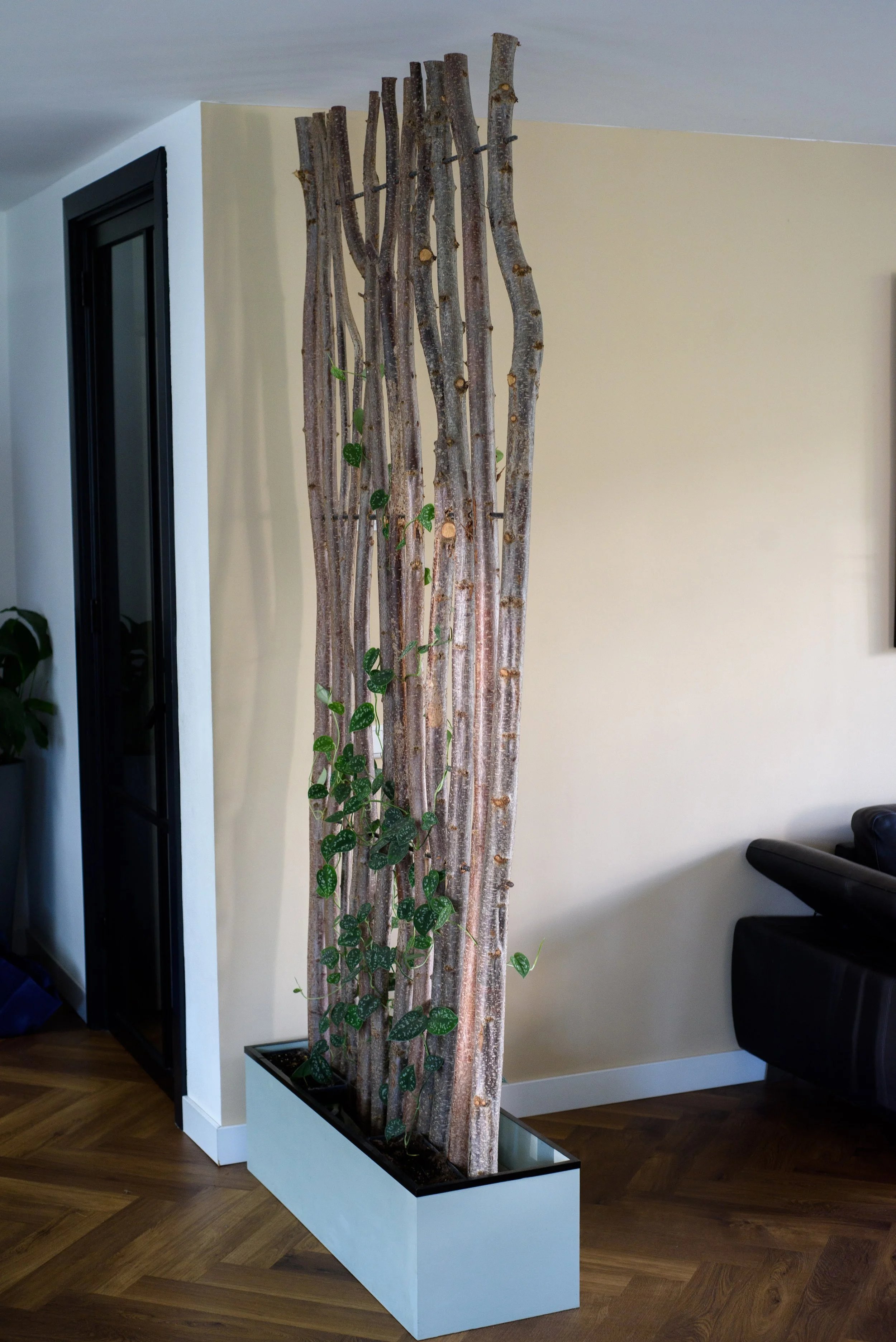 Een Roomdivider is een kamerscherm die voor een visuele afscheiding in een grote kamer zorgt. Deze roomdivider is gemaakt van hazelaartakken en heeft een dubbele plantenbak, waarin het groen groeit. In dit geval een klimplant die de roomdivider mettertijd geheel zal vullen. Onder de bak zitten wieltjes zodat hij makkelijk kan worden verschoven.